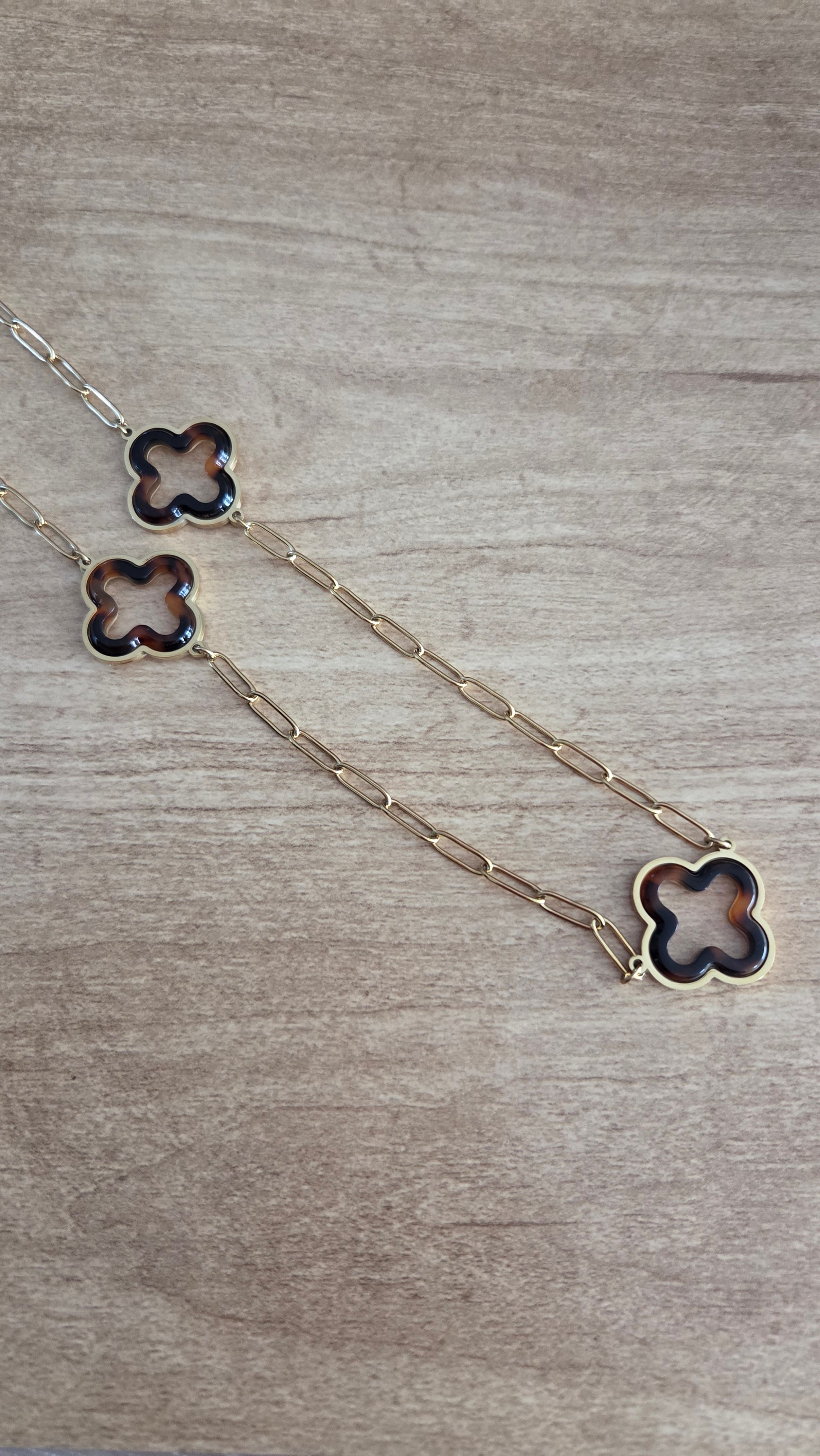 Ce sautoir en acier inoxydable doré séduit par ses maillons délicats et ses pendentifs trèfles ajourés, sublimés par des détails effet écaille. Chic et raffiné, il apporte une touche de lumière et d’originalité à vos tenues, que ce soit pour un look quotidien sophistiqué ou une occasion spéciale.